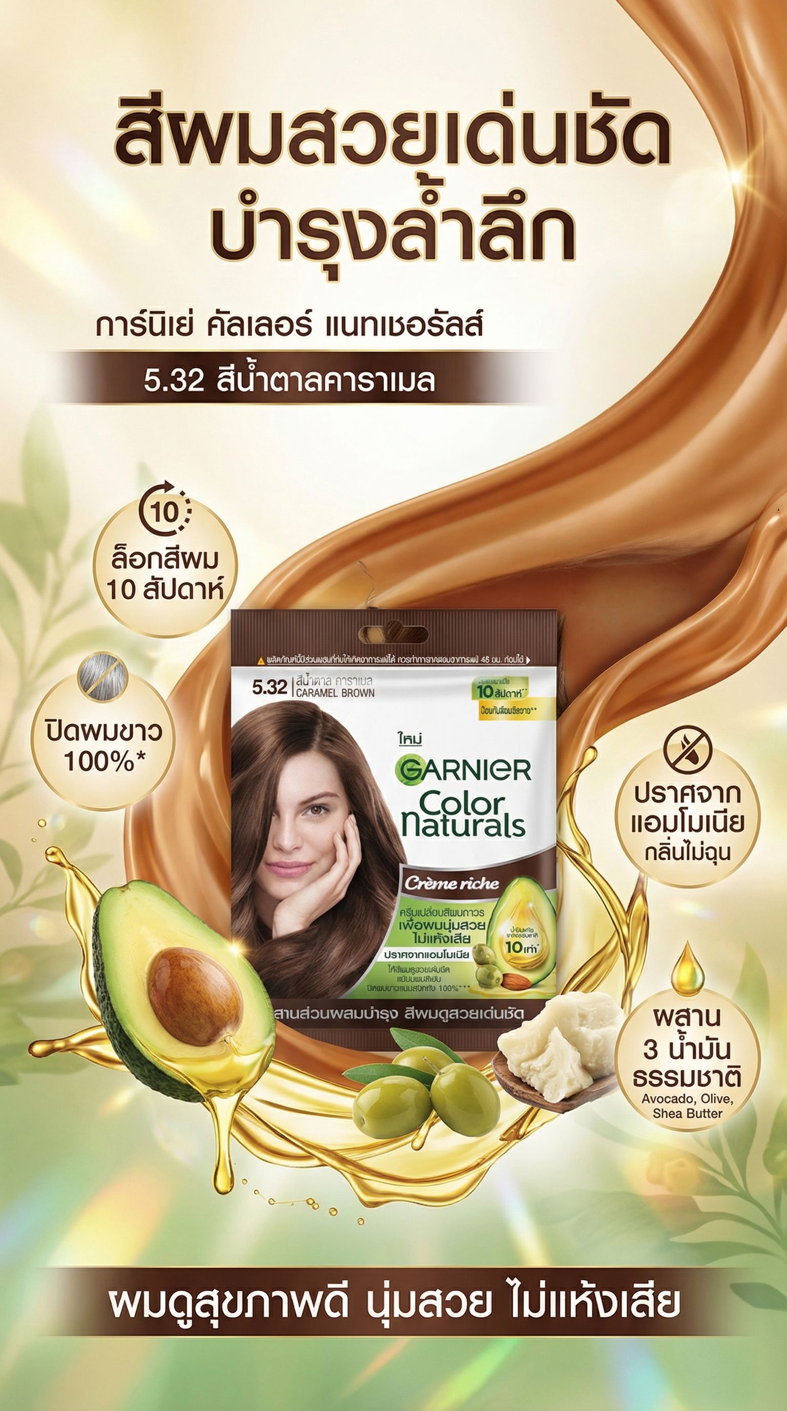 การ์นิเย่ คัลเลอร์ แนทเชอรัลส์ 5.32 สีน้ำตาลคาราเมล เป็นครีมเปลี่ยนสีผมสูตรบำรุงที่ออกแบบมาเพื่อให้สีผมสวยเด่นชัด เหมาะสำหรับคนเอเชียโดยเฉพาะ ด้วยส่วนผสมจากน้ำมันธรรมชาติที่ช่วยบำรุงผมให้นุ่มลื่น ไม่แห้งเสีย พร้อมปิดผมขาวได้ถึง 100% และล็อกสีผมให้ติดทนนานถึง 10 สัปดาห์